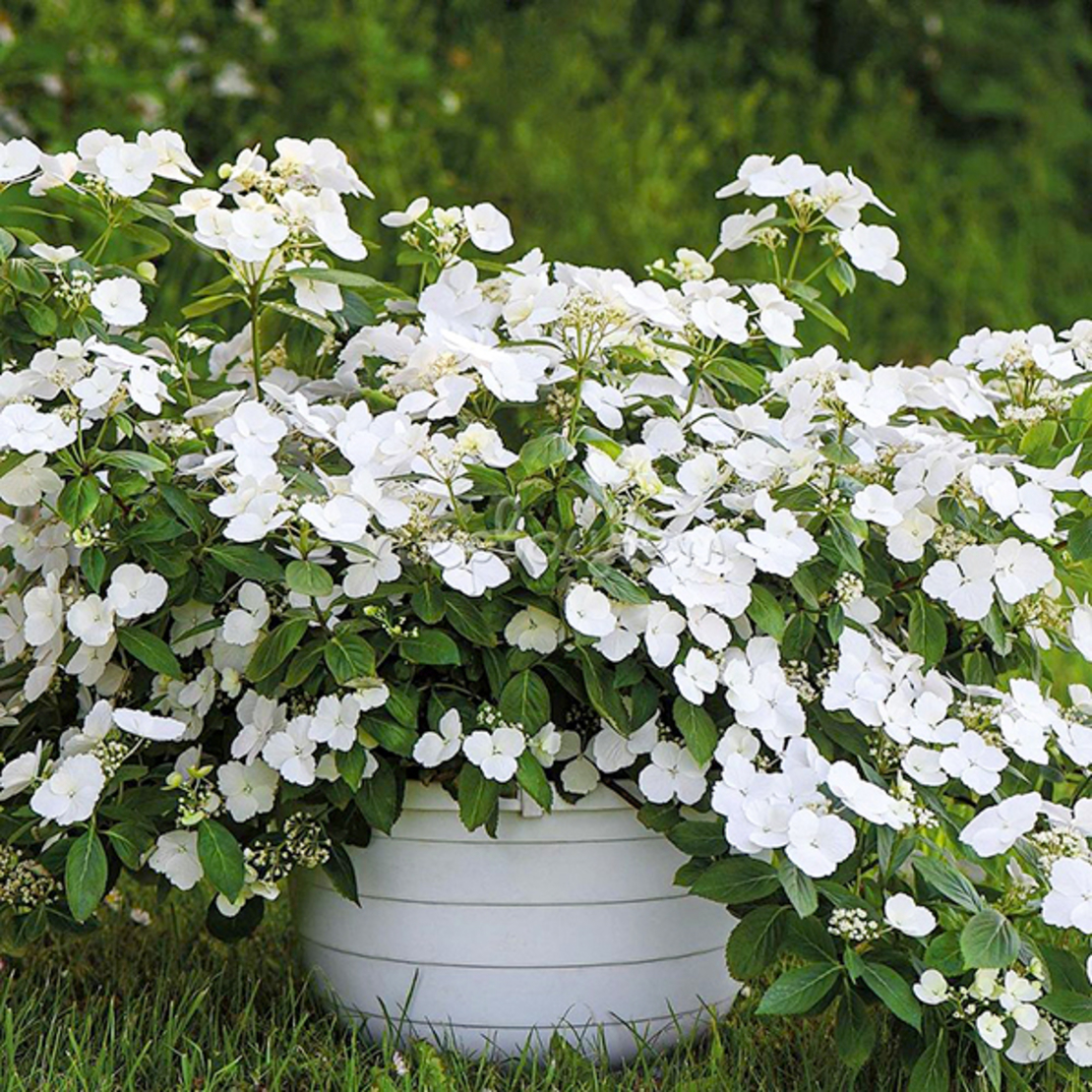Соцветия окаймлены большими, элегантными стерильными цветками чистого белого цвета, часто более розовыми в холодную погоду. Количество цветков на соцветие, стерильных от 8 до 10, плодущих 330. Естественный сезон цветения с апреля по июнь-сентябрь. Высота соцветия 8,5 см, ширина 13,5 см. Высота в среднем 50,0 см, ширина 100,0 см.